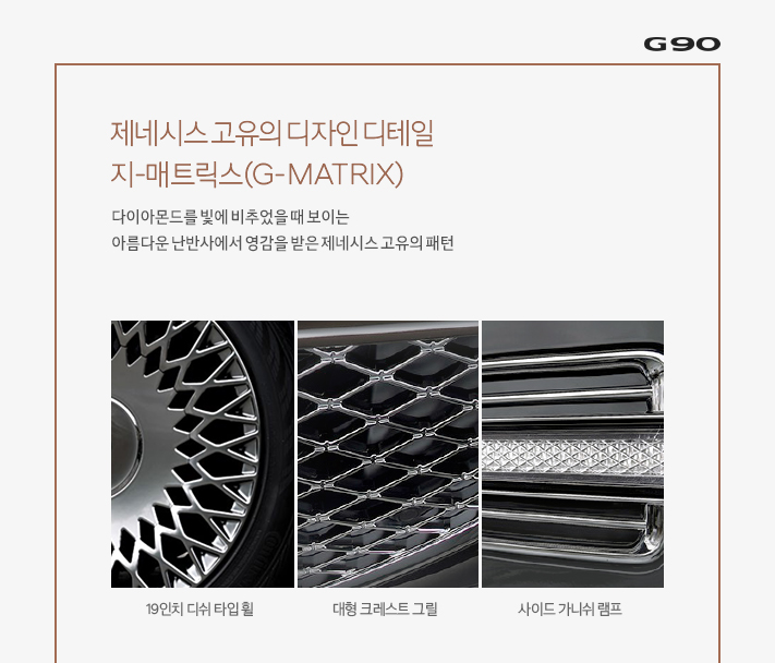 제네시스 최초로 적용한 '메탈 지-매트릭스 패턴 가니쉬'는 한국 전통 공예에서 비롯된 '상감 기법'을 응용한 장식으로, 도어 트림에 적용한 애쉬 우드 또는 포지드 카본 소재에 제네시스 상징인 두 줄과 지0매트릭스를 리얼 메탈로 새겨 넣어 고급감을 극대화 했습니다.