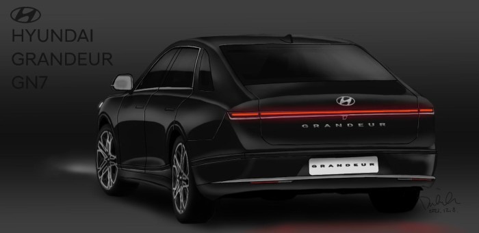 3세대 그랜저 플랫폼이 적용되면서 그랜저 GN7 차체 역시 K8과 유사한 사이즈로 늘어나게 될 것 같고, K8보다는 전장이 더 크게 나오지 않을까 하는 전망이 있습니다. 전면부 디자인으로는 스타리아 세단? 버전이라고 불릴만큼 스타리아 디자인을 꼭 빼닮았고 후면의 리어램프는 일직선으로 이어진 제네시스 형상을 띄고 있습니다.